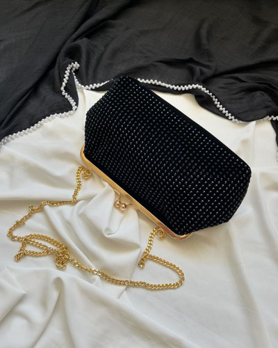 کیف مجلسی زنانه بند زنجیر طلایی رنگ ثابت جنس مخمل اصل نگین دار
